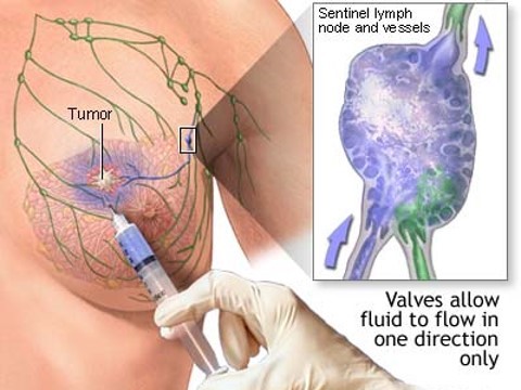 The Sentinel Node is located by injecting one or two dyes around the periareolar margin or around the tumour site, just prior to surgery.