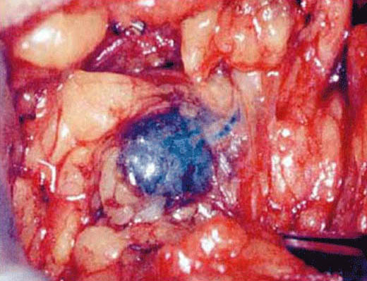 Precise location can be achieved with little trauma to the surrounding tissue using the localisation techniques of a gamma probe and visualising the blue dye.